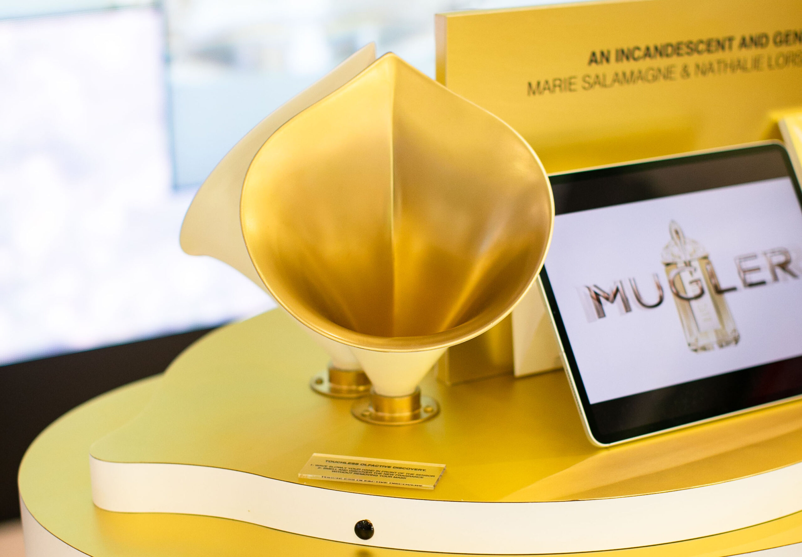 Nous avons réalisé pour Mugler le totem Arum, une installation immersive conçue pour sublimer l’identité de la marque. Équipé d’un capteur de présence, ce totem déclenche automatiquement la diffusion du parfum dès le passage d’un visiteur. Ce projet illustre notre maîtrise de l’interactivité et de l’intégration technique, transformant un élément visuel en une expérience olfactive captivante pour le retail.